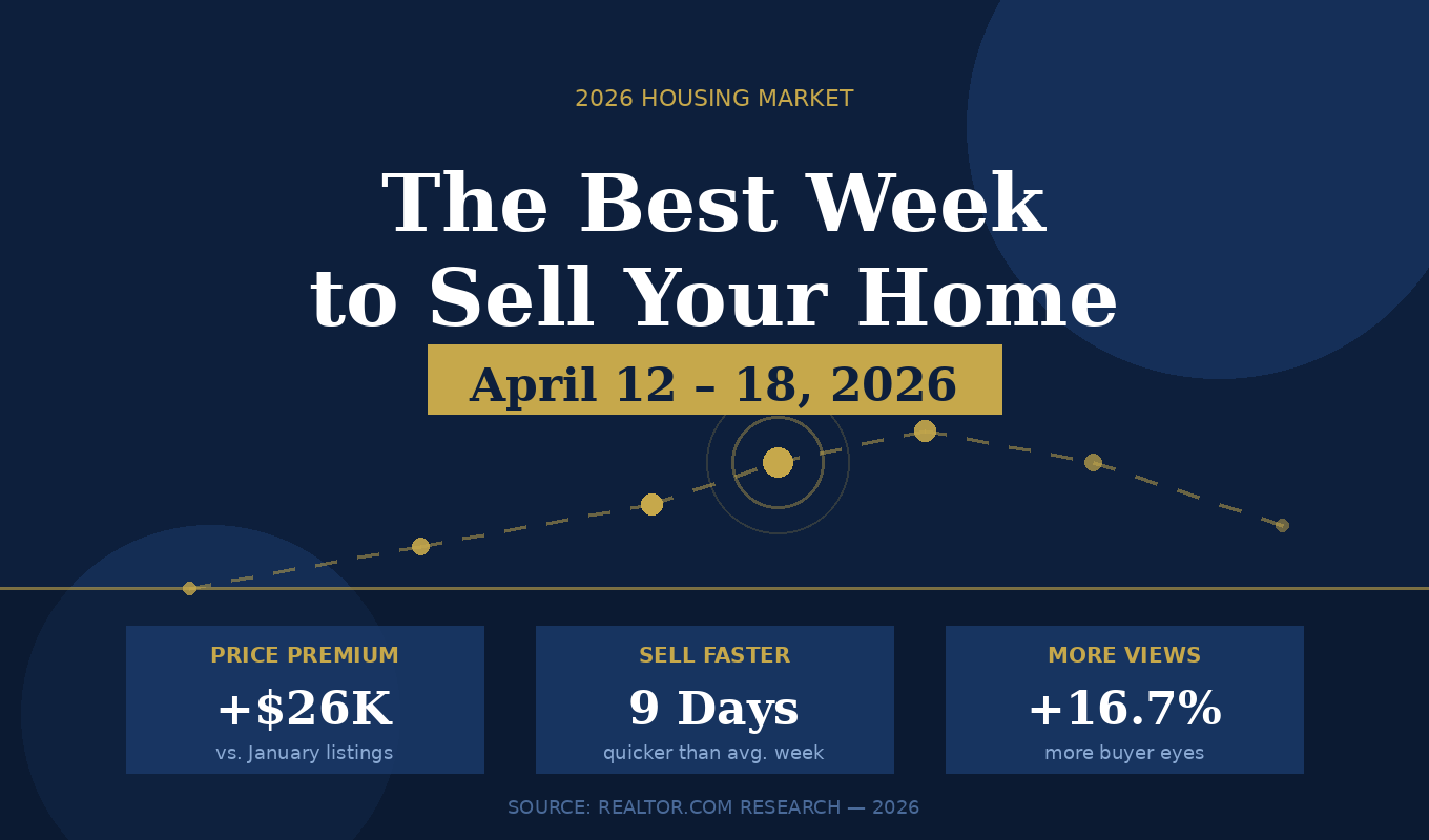 The week of April 12–18, 2026 is the single best time to list a home this year, according to Realtor.com's annual Best Time to Sell report, published March 18, 2026. The analysis identifies a "Goldilocks" window where higher prices, elevated buyer demand, faster sales, and limited seller competition converge to create optimal conditions. Sellers listing during this week could see prices $26,000 higher than January listings and $5,300 above the annual average—while selling nine days faster and facing nearly 19% fewer price reductions than typical weeks. The report arrives at a pivotal moment: mortgage rates briefly touched the 5% range for the first time in 3.5 years in early 2026, pulling sidelined buyers back into the market, but geopolitical instability and rate volatility have since complicated the outlook.